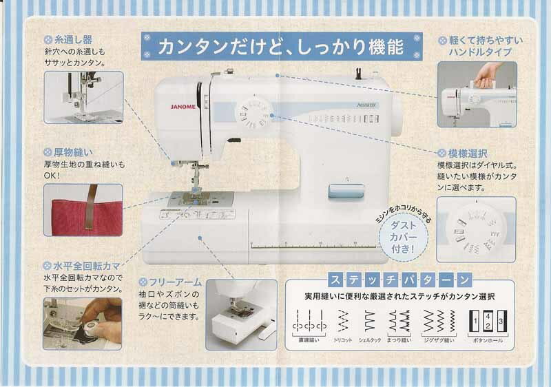 商品情報 メーカー ジャノメ(JANOME) サイズ 幅385mm 奥行150mm 高さ282mm質量:5,0kg 付属品 基本押え、たちめかがり押え、ボタンホール押さえ、針、ボビン×3、ドライバー、シームリッパー、糸立棒、糸こま押え、取説、電源コード一体式フットコントローラー、ソフトカバー、保証書【ミシン】【送料無料】【5年保証】 ジャノメ 電動ミシン JN508DX (JN-508DX) フットコントローラー式【smtb-MS】【RCP】 【ジャノメミシン】【手芸用品】【ミシン本体】 簡単操作の電動ミシン登場! 最低限必要なステッチ、水平がまを搭載したシンプル電動ミシンです。